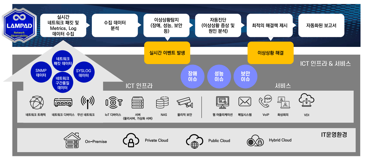 LAMPAD는 네트워크 내 모든 행위들을 관찰하여 ICT인프라 및 서비스 전반에 걸친 각종 장애 미 성ㄴ증, 보안이슈를 사전에 인지하고 대응하며, 장애발생 시 신속히 복구할수 있도록 명확한 Actionable Insight 제공